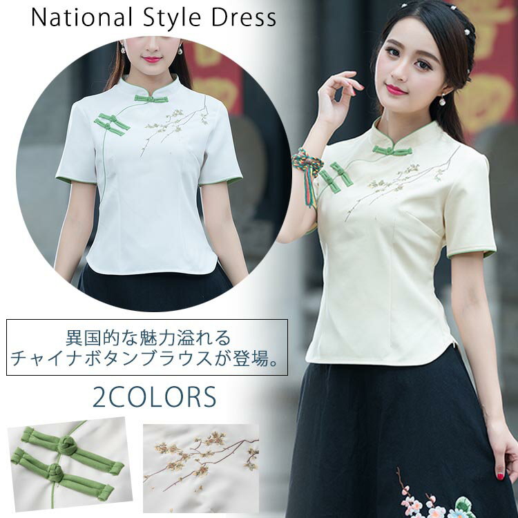 メール便送料無料 チャイナ風 トップス チャイナ服 半袖 大きいサイズ チャイナボタン 刺繍 レディース 上着