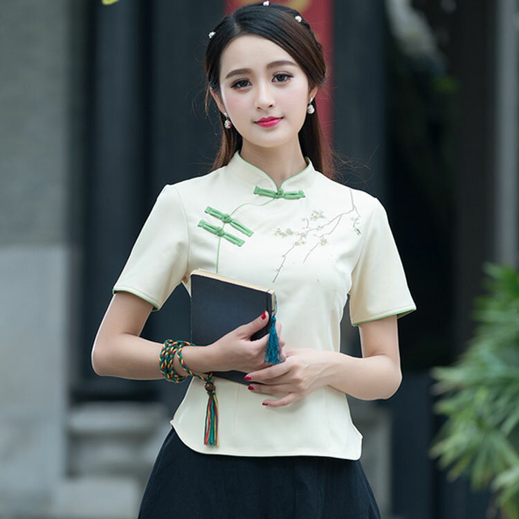 綿麻刺繍トップス チャイナボタン ブラウス トップス 刺繍ブラウス 刺繍トップス 半袖 綿麻 リネン スリム 優雅 レディース 春夏 刺繍 オシャレ
